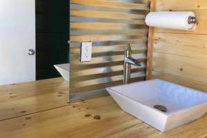 You have a full shared kitchen with a coffee pot, microwave, fridge, etc available in the pavilion next to the cabin. It also includes the use of the campfire area and covered picnic table area with a full kitchen.