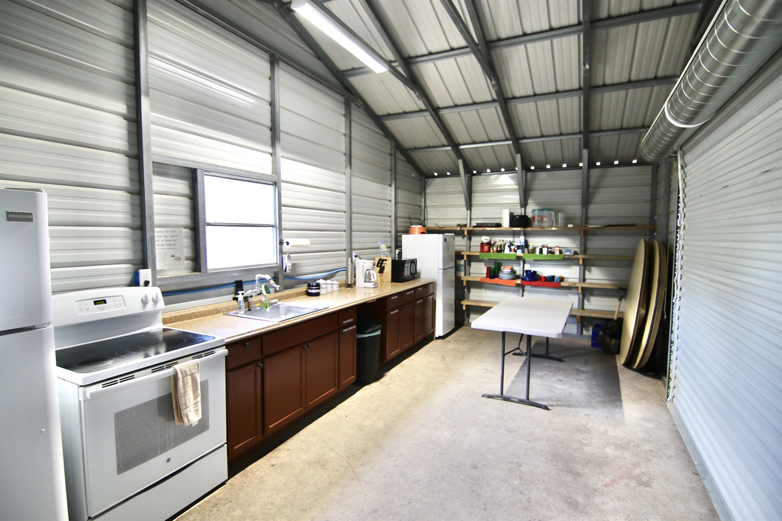 You have a full shared kitchen with a coffee pot, microwave, fridge, etc available in the pavilion next to the cabin. It also includes the use of the campfire area and covered picnic table area with a full kitchen.