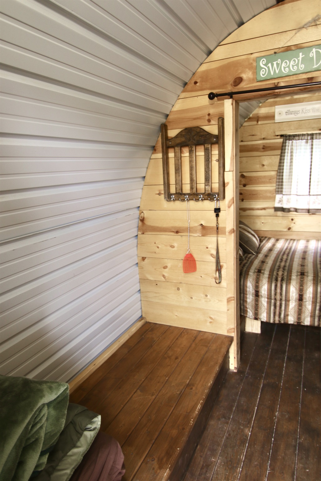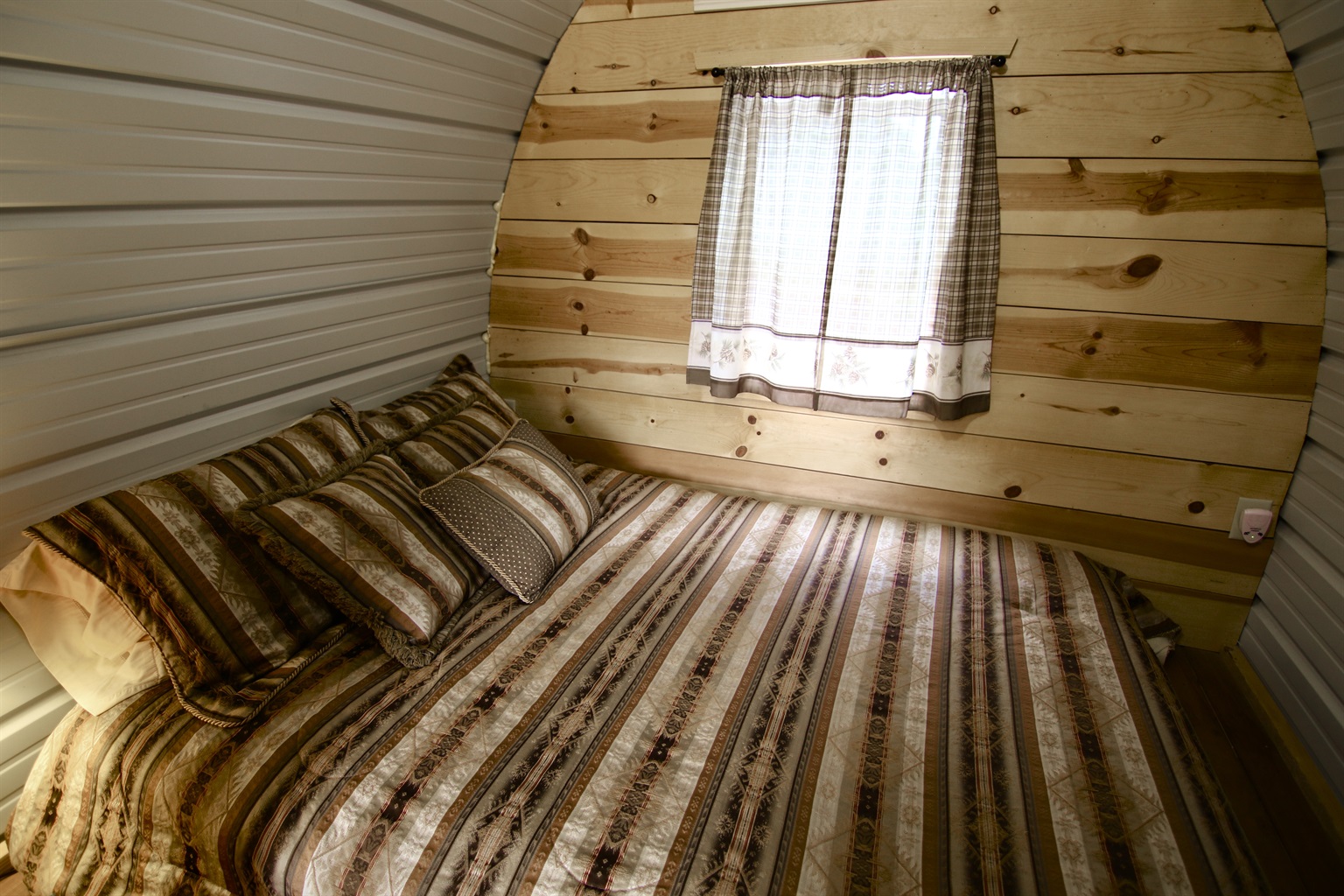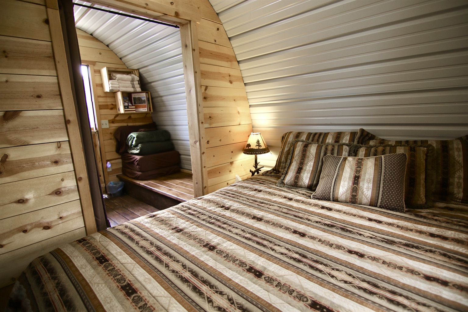 No waiting in hotel lines here! Just drive in and make yourself at home. Our Western Wagon is a great place to stay for groups of up to 4 people. The wagon is split into two sections, the first section has a seating area with mattresses and linens for two single beds and the second area has a queen bed. This makes it ideal for young families, friends, or couples wanting to experience something new. The wagon is complete with a cozy front porch, Wi-Fi, private parking, and electricity.